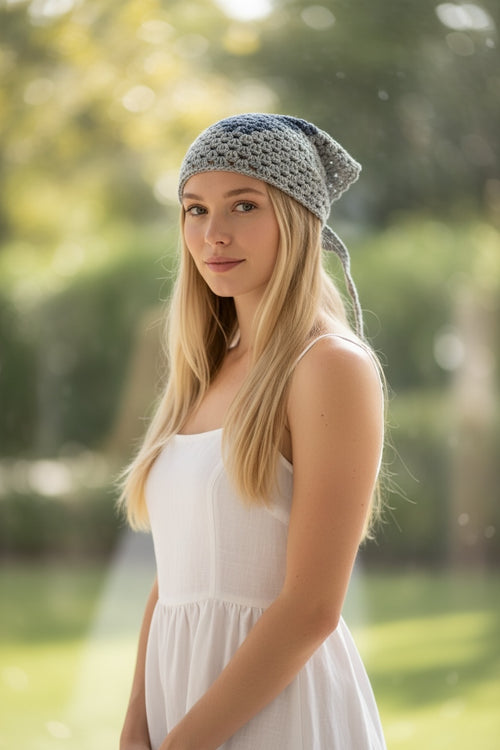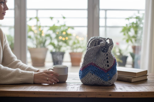 Bolsa de Mano Crochet, Gris y Azul, Tejida a Mano, Estilo Boho, con Asas